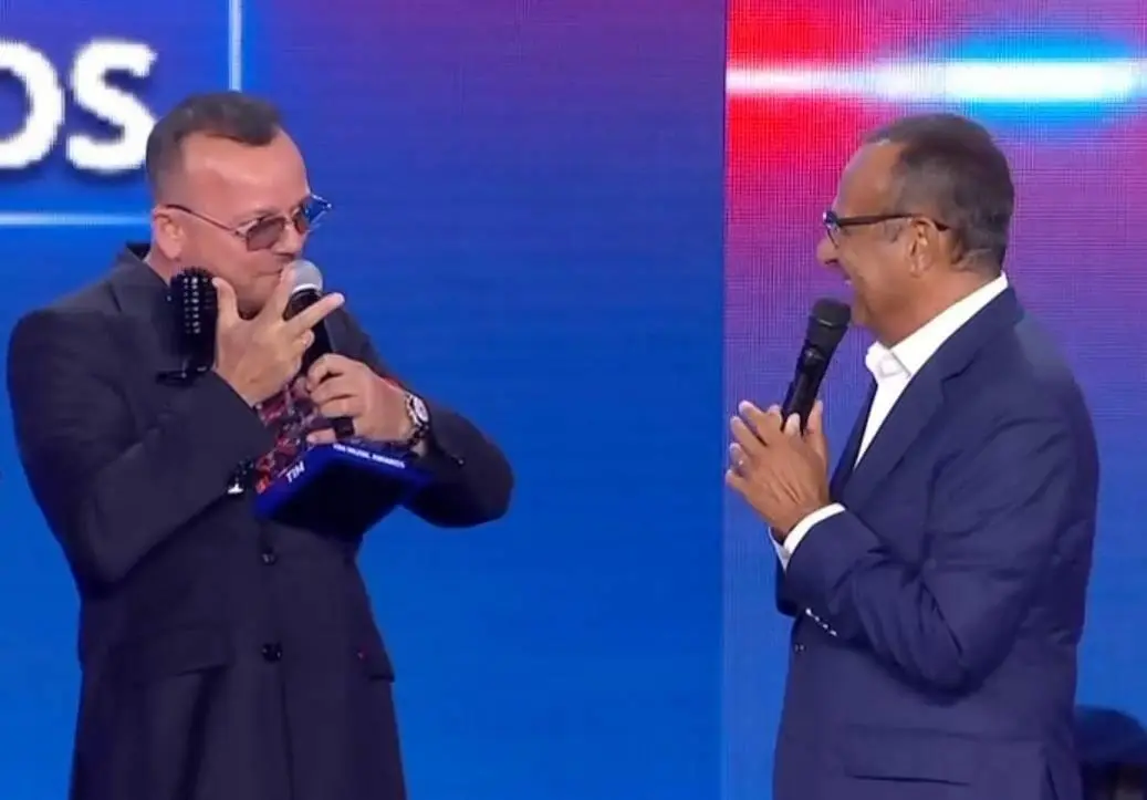 Il conduttore fiorentino ha consegnato due premi a Gigi D'Alessio per le sue canzoni e ha commentato: "Complimenti e mi raccomando: stasera parliamo soltanto di musica, non di calcio".