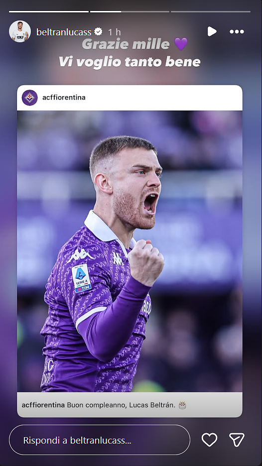 Al consueto post che la Fiorentina riserva ai suoi tesserati in occasione del compleanno è susseguita la tenera risposta di Beltran, che ha postato sulle proprie storie Instagram: “Grazie mille, vi voglio tanto bene”. Segno di un legame mai sopito, con l'argentino che cercherà l'occasione per il proprio rilancio una volta rientrato a Firenze.
