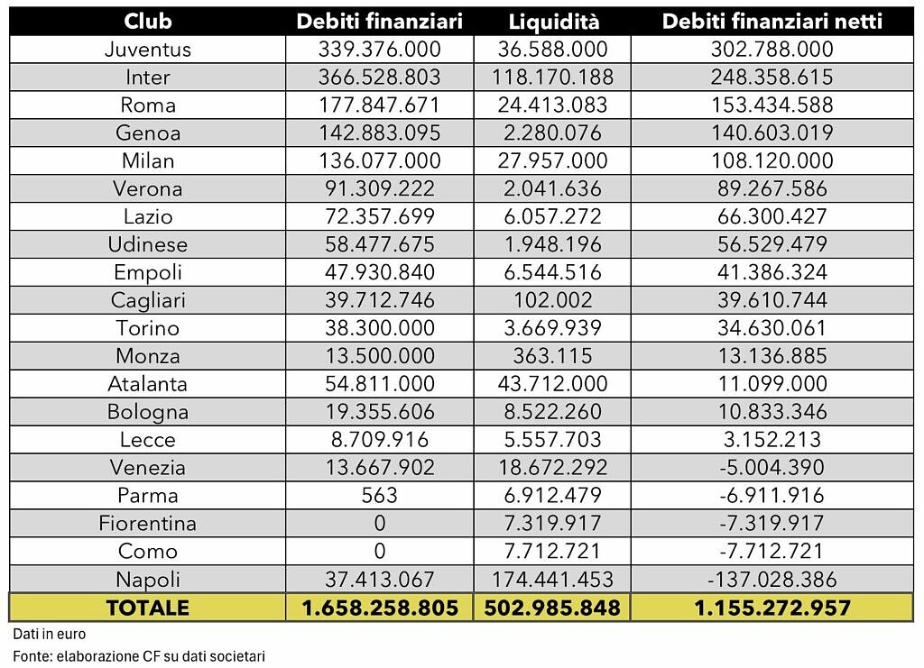 Quali sono i club più indebitati in Serie A? La fotografia dell’indebitamento dei club di Serie A al 30 giugno 2025, realizzata da Calcio e Finanza analizzando i conti delle squadre che hanno partecipato alla massima serie nella stagione 2024/25, conferma come il tema della sostenibilità finanziaria resti centrale nei bilanci delle società italiane.