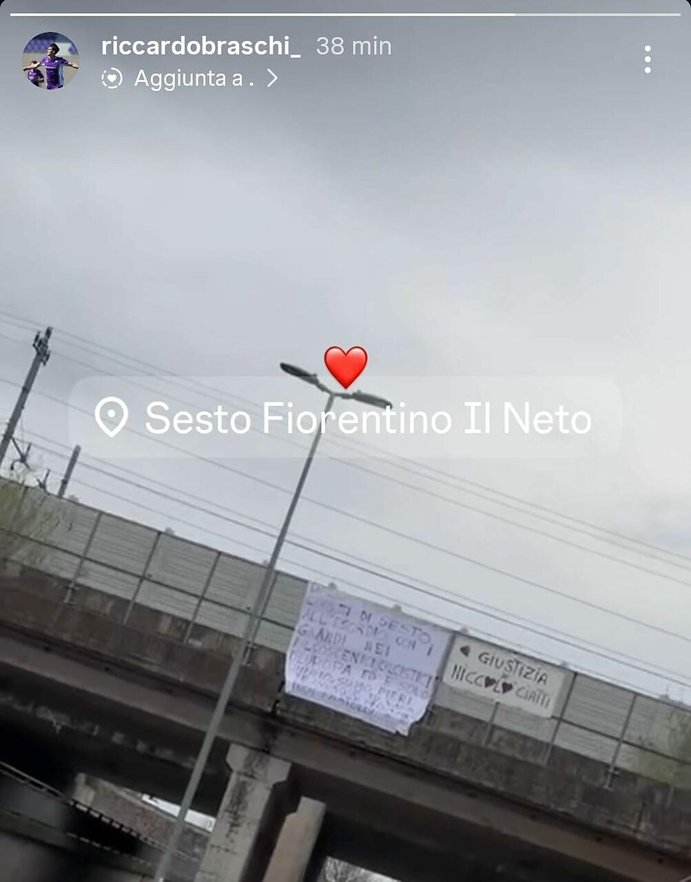 Alcuni tifosi viola e amici di Riccardo Braschi hanno appeso uno striscione per l'attaccante classe 2006 della Fiorentina in zona Sesto Fiorentino, per omaggiare il ragazzo che da poche ore ha fatto il suo esordio con la prima squadra viola.