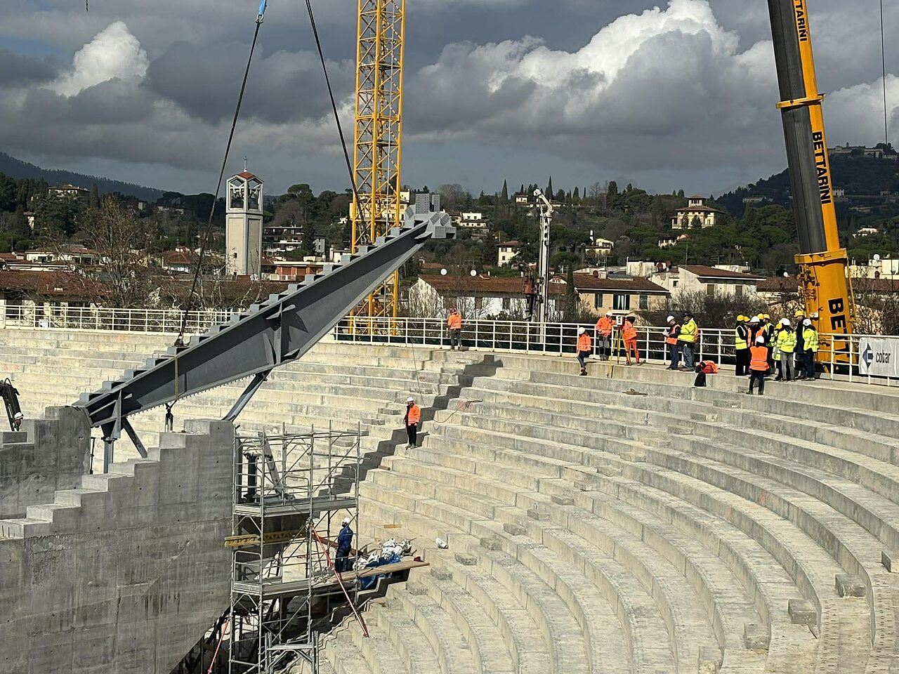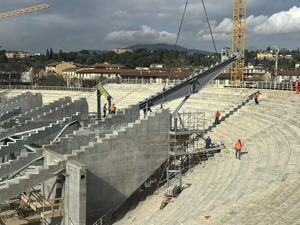 Giornata importante per il futuro dello stadio Artemio Franchi della Fiorentina. Questa mattina infatti è stata poggiata la maxi trave in acciaio che sorreggerà le nuove gradinate della Curva Fiesole, andando a sommarsi al montaggio di altre travi più piccole. La nuova Fiesole comincia dunque a prendere forma in maniera importante, come testimoniano le foto e il video realizzati da Fiorentinanews.com: