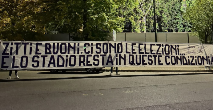 “Per la sosta delle nazionali veniamo tutti a fare da manovali!”, “Zitti e buoni, ci sono le elezioni… e lo stadio resta in queste condizioni!”. Questo il testo dei due striscioni esposti e firmati dalla Curva Fiesole.