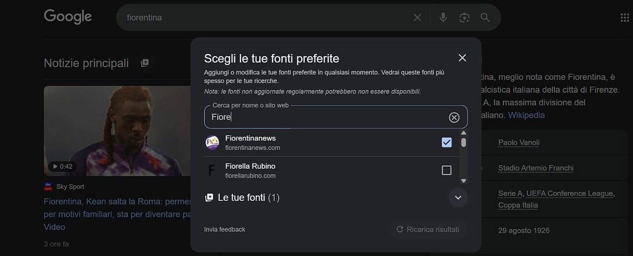 Per iniziare provate a fare la ricerca per parola chiave sul motore di ricerca, per esempio digitando “Fiorentina”. Cliccando sull’icona a forma di stella accanto alla sezione Notizie principali, si aprirà un menù ed è lì che potete scrivere Fiorentinanews e poi selezionare la nostra testata. Una volta selezionate le fonti, queste appariranno più frequentemente nella sezione “Notizie principali” o nella sezione dedicata “Dalle tue fonti”.