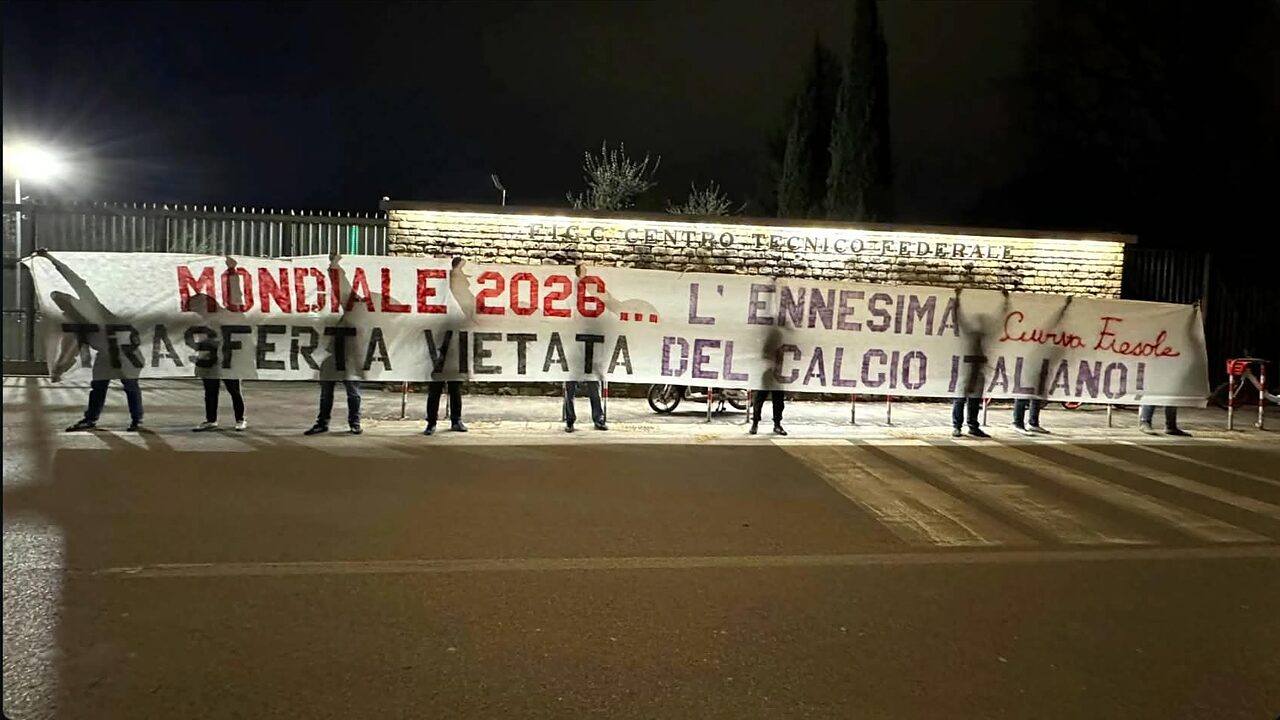 Spunta uno striscione della Curva Fiesole nella notte: il tifo organizzato della Fiorentina si fa sentire dopo l'esclusione dai Mondiali della Nazionale.