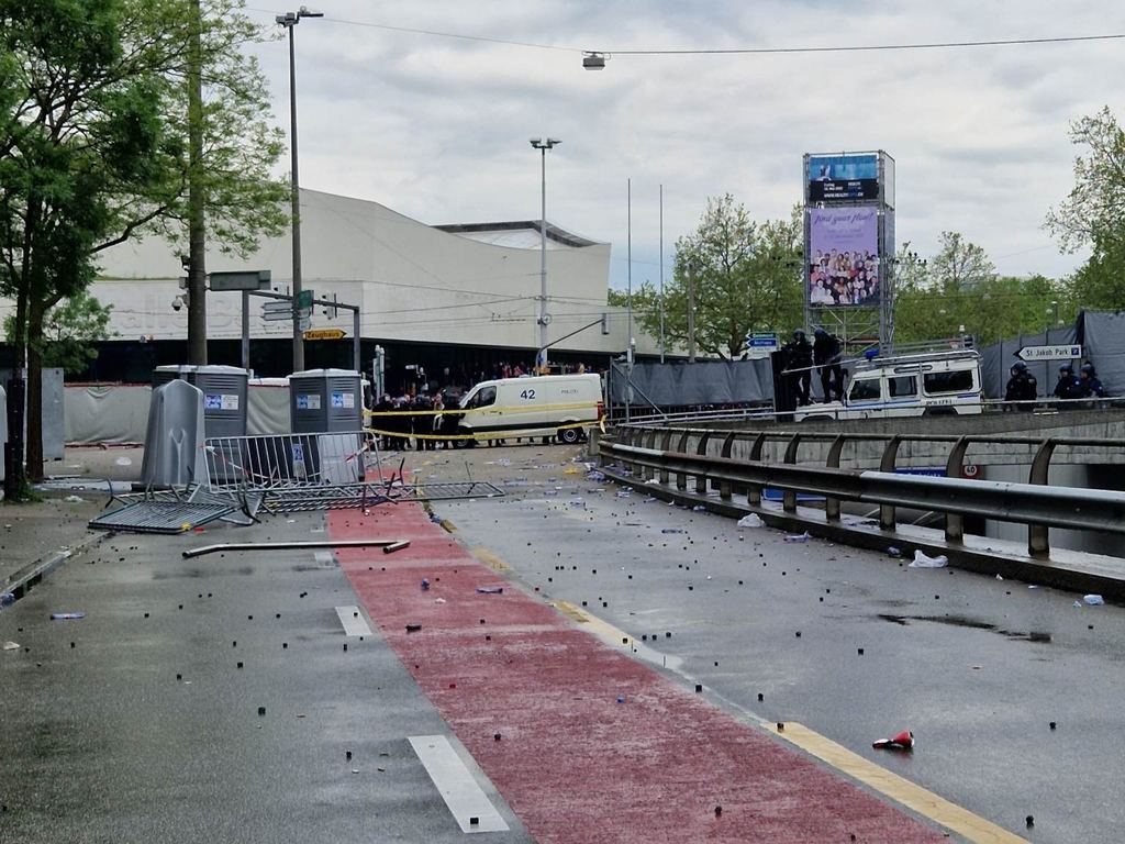 Arrivano nuovi aggiornamenti da Basilea, e raccontano di una situazione gestita malissimo dalle autorità locali. Dopo aver rinchiuso i tifosi della Fiorentina fuori dallo stadio, infatti, la polizia ha lasciato transitare il corteo degli ultras del Basilea proprio accanto al settore ospiti. Ciò ha portato a un reciproco lancio di oggetti tra le due tifoserie, e si sono registrati scontri anche tra i tifosi della Fiorentina e la polizia stessa. Tra l'altro, le due tifoserie cominciano anche a mischiarsi con centinaia di tifosi viola che si sono ritrovati in mezzo a quelli del Basilea. Nella foto realizzata da Fiorentinanews.com si vedono bene tutti gli oggetti, di varie forme e dimensioni, a terra dopo il passaggio del corteo svizzero.