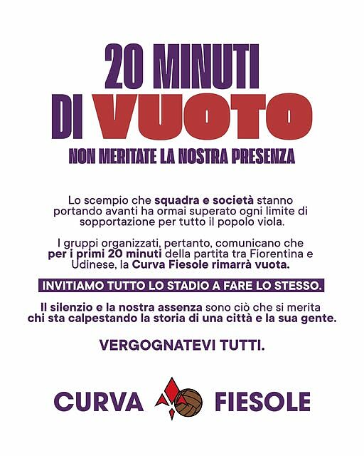 Questo il testo del comunicato: "Lo scempio che squadra e società stanno portando avanti ha ormai superato ogni limite di sopportazione per tutto il popolo viola. I gruppi organizzati, pertanto, comunicano che per i primi 20 minuti della partita tra Fiorentina e Udinese, la Curva Fiesole rimarrà vuota.
