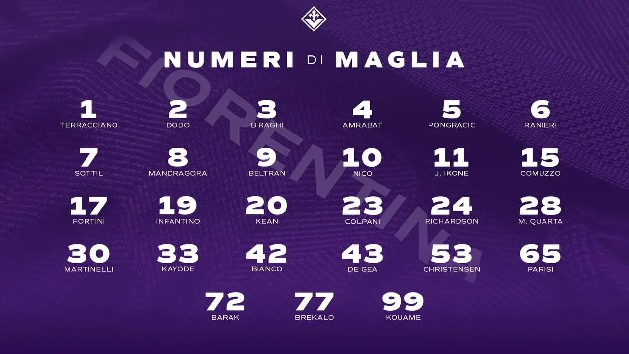In attesa che Gudmundsson venga ufficializzato e che si scopra anche il suo numero di maglia, sono da segnalare alcune novità. Ranieri prende il 6, Amrabat il 4, Mandragora l'8. Per quanto riguarda i nuovi acquisti De Gea deve accontentarsi del 43, visto che Terracciano non ha voluto rinunciare al classico 1. Maglia numero 5 per Pongracic, 20 per Kean, 23 per Colpani e 24 per Richardson. Di seguito la lista completa: