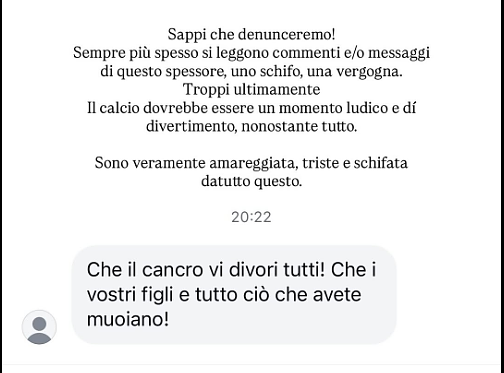 La modella ha denunciato tutto sui propri canali, aggiungendo: “Sappi che denunceremo! Sempre più spesso si leggono commenti e/o messaggi di questo spessore, uno schifo, una vergogna. Troppi ultimamente. Il calcio dovrebbe essere un momento ludico e di divertimento, nonostante tutto. Sono veramente amareggiata, triste e schifata da tutto questo”.
