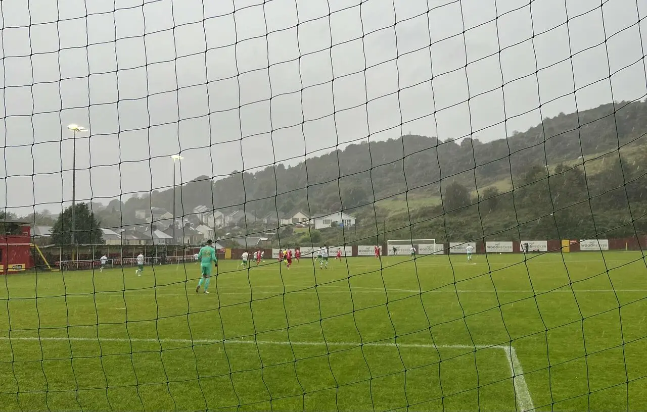 Pioggia tipica britannica, casettine basse sullo sfondo e una collinetta che accompagna il panorama. Il tutto all'interno di un piccolo impianto sportivo con tribune ad altezza uomo. Che poesia questo scenario dove sta giocando il The New Saints.