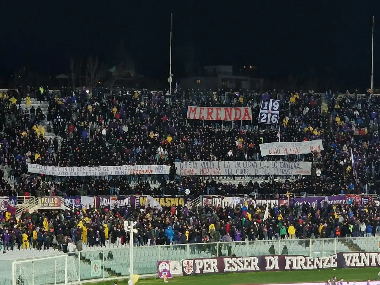 Nei primi minuti di partita, un assordante silenzio ha avvolto lo stadio Franchi come annunciato dalla Curva Fiesole negli scorsi giorni. Il ricordo è per Marco Pezzati e Alessio Repezzi, due giovani tifosi viola di recente scomparsi.